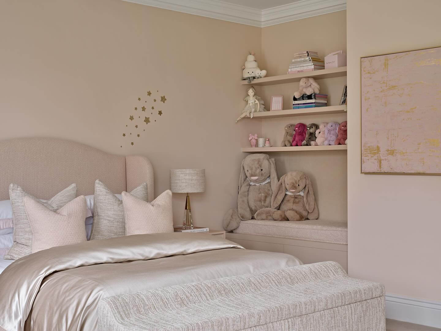 - Use a storage bench at the foot of the bed; it corrals plush friends and dress-up pieces, doubles as a stage, and delivers extra seating for story times.