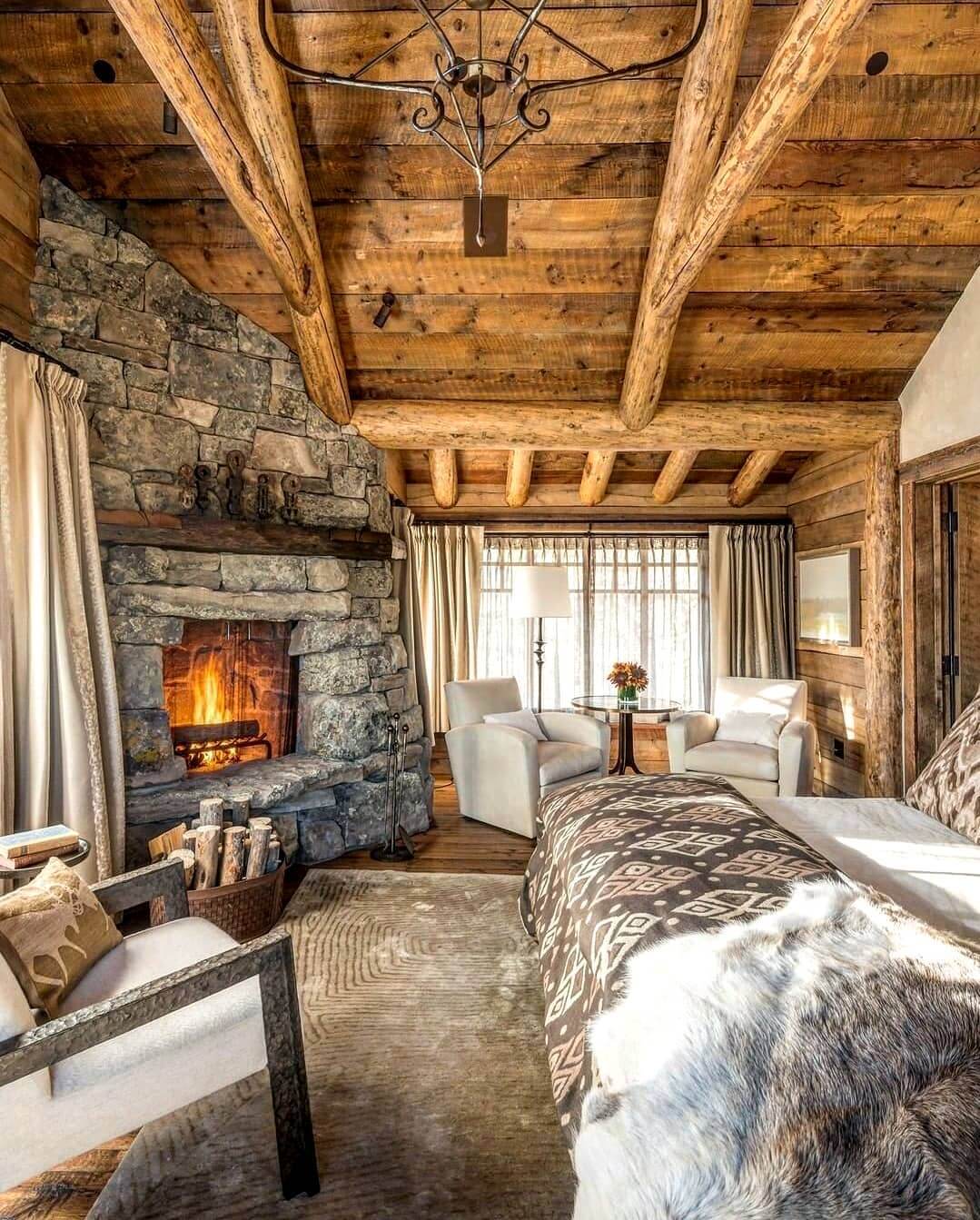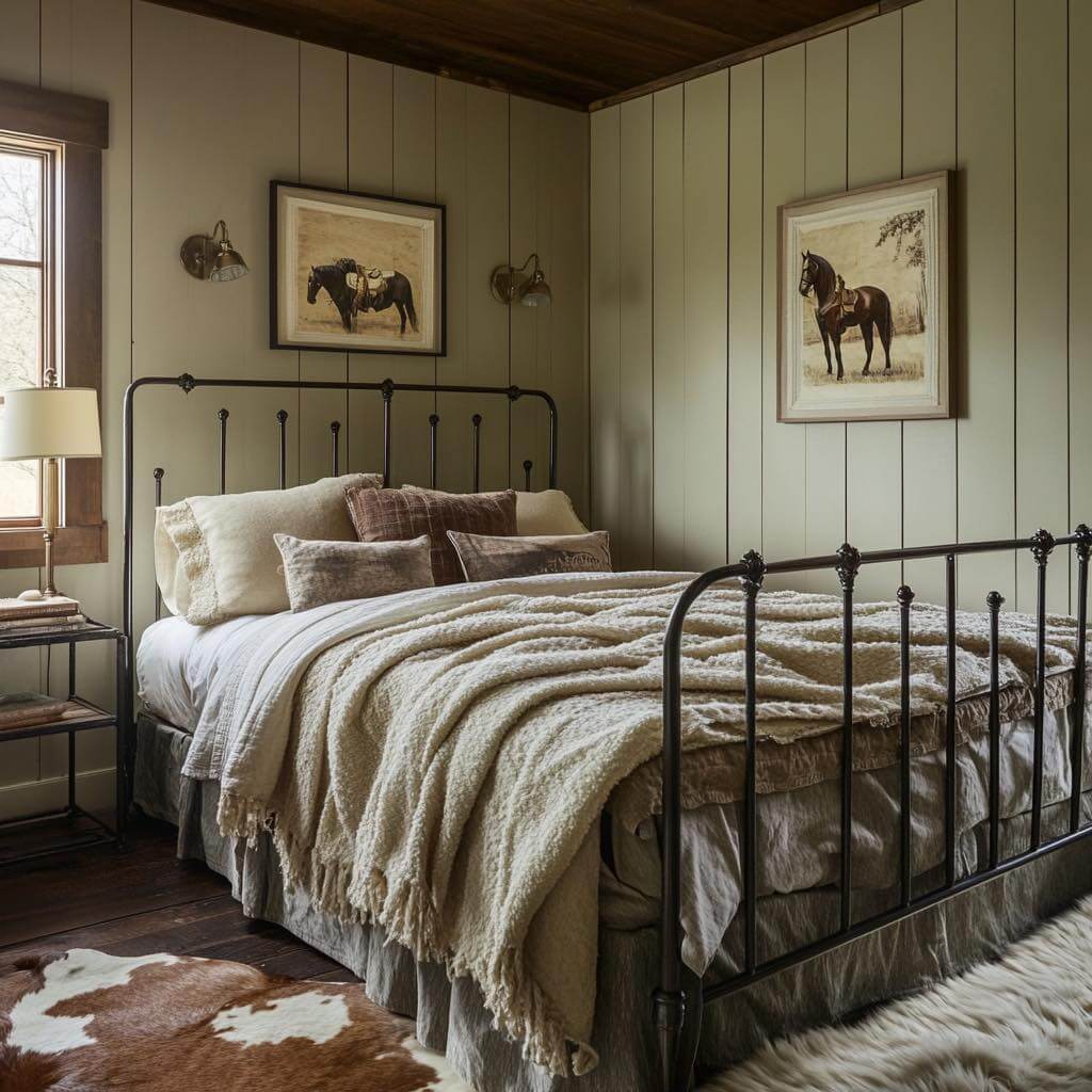 Rustic rooms love contrast, and nothing grounds all that warm wood like matte-black iron. Swap in a wrought-iron chandelier, swing-arm sconces, or a simple rod-and-ring curtain setup to add crisp lines and a heritage feel. Keep finishes low-sheen—blackened steel, aged iron, or oil-rubbed bronze—so the metal feels soulful, not stark. Repeat the tone in small doses (cabinet pulls, a mirror frame, lamp finials) to create a quiet rhythm that ties the room together. Layer your lighting: ambient (overhead), task (bedside), and accent (picture light, candle lanterns) on dimmers to dial the mood from bright and functional to soft and sleepy. Against limewashed or beadboard walls, iron’s shadow play adds depth that reads instantly cozy. The trick is restraint—two or three repeated moments are enough. Pair with linen shades, seagrass baskets, and leather details to bridge rustic warmth and modern clarity.