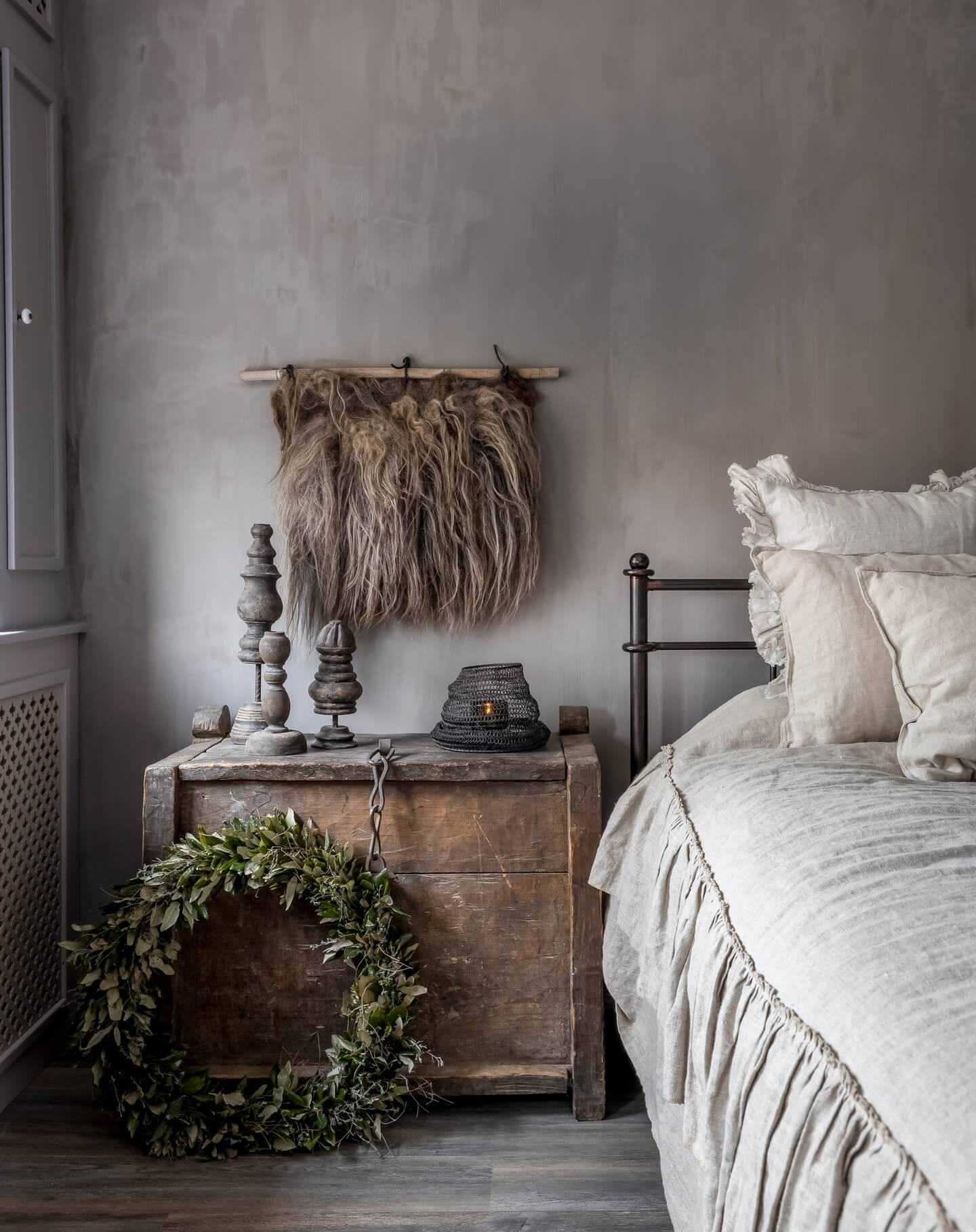 The final layer turns a rustic bedroom into a retreat. Pair woven wood shades or linen Roman blinds with floor-grazing linen curtains for softness and light control; leather tie-backs or iron holdbacks add a crafted note. In winter, swap to lined panels for insulation and layer a heavier throw at the foot of the bed; in summer, trade in a lightweight quilt and airy gauze for breathability. Introduce subtle, woodsy scent—cedar, amber, smoke, or vetiver—via candles, room sprays, or a ceramic oil diffuser to deepen the cozy atmosphere. Keep a woven lidded basket for quick blanket storage and a boot tray or low basket for bedroom slippers to reinforce everyday ritual. These small, seasonal updates keep your rustic bedroom feeling fresh and intentional while preserving the calm, collected mood you’ve built.