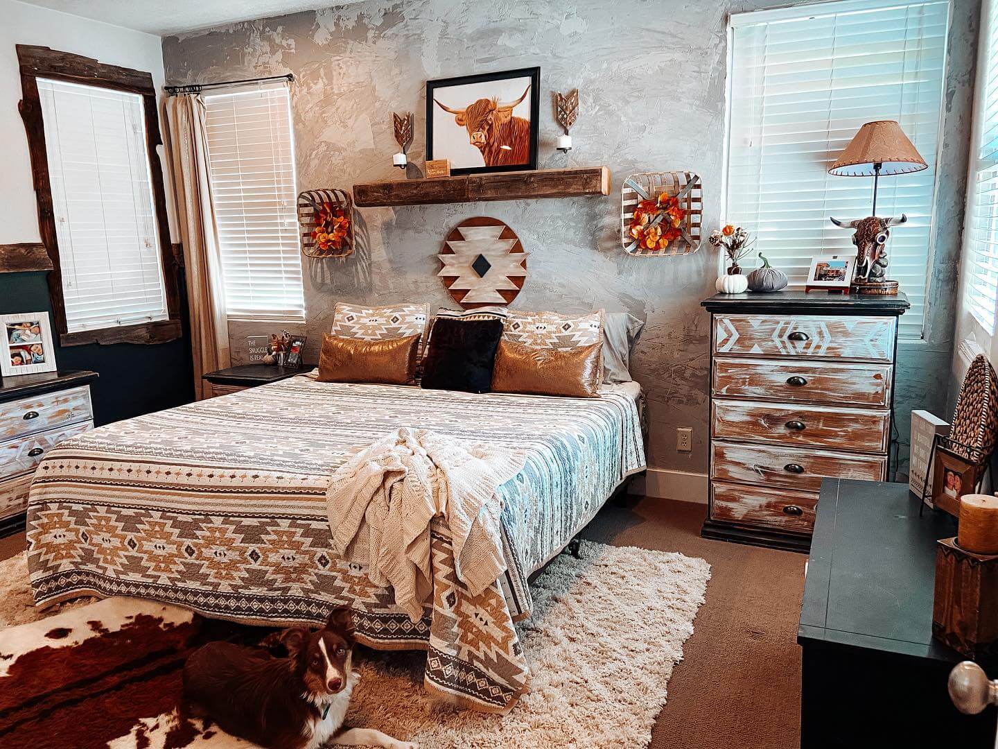 A well-chosen rug quiets echo, adds warmth, and visually pulls the room together. Start with a natural-fiber base—jute, sisal, or seagrass—in a chunky weave for organic texture. Size up so the rug extends at least 8–12 inches beyond the sides of a queen bed (more for a king) to anchor the furniture layout. Then layer a smaller vintage piece—Turkish kilim, hand-knotted Persian, or a faded tribal rug—over the foot or slightly off-center for a relaxed, collected look. Earthy palettes (rust, indigo, sage, sand) reinforce rustic warmth without overpowering. If you love hides, a cowhide draped on the diagonal adds fluid shape and an authentic ranch note. Use a quality rug pad for comfort and to keep layers in place. This stacking approach delivers depth and patina instantly, especially in newer builds that need soul.