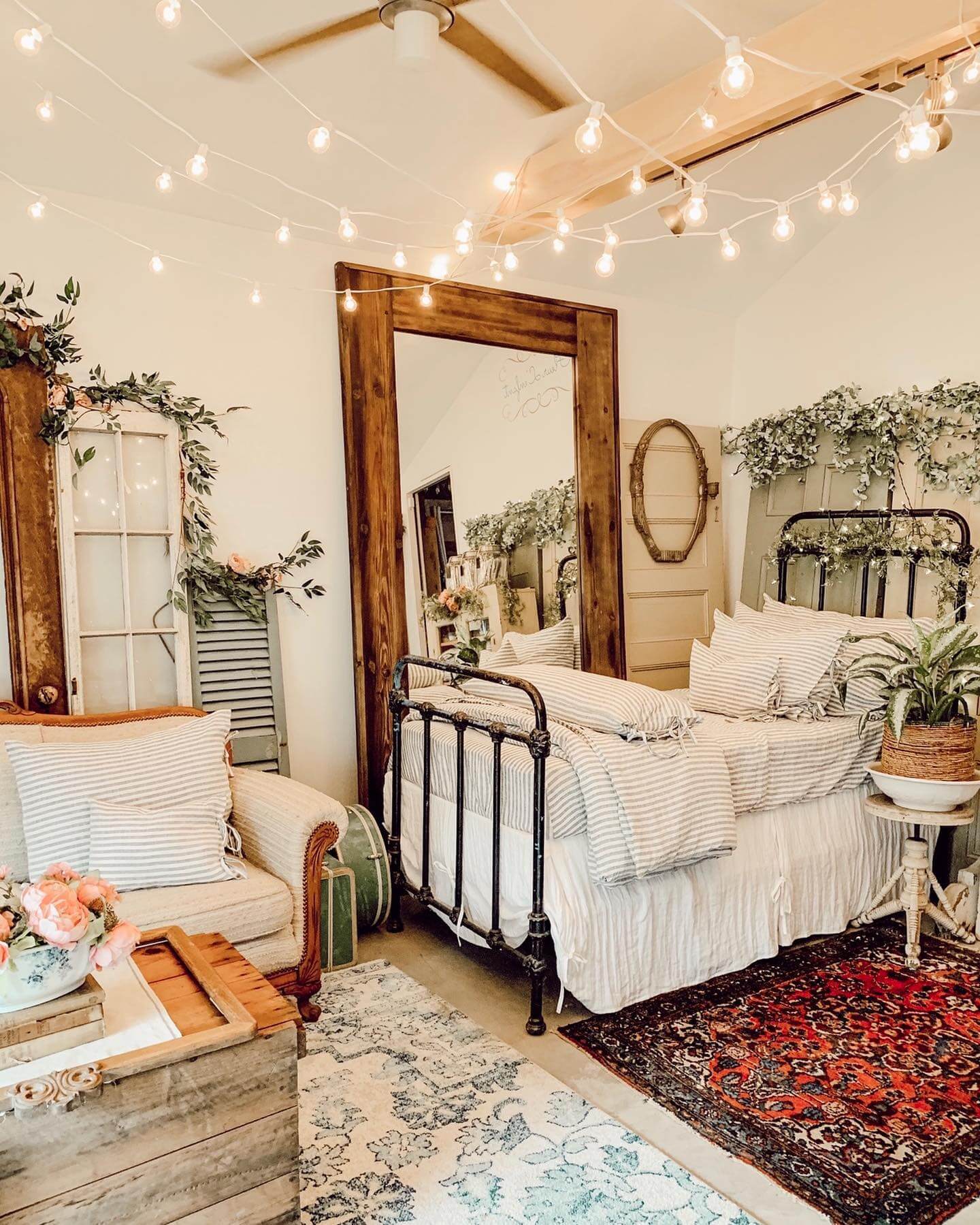 A large, distressed mirror is a rustic multitasker—brightening the room, expanding sightlines, and showcasing beautiful patina. Opt for a wood frame with wormholes, saw marks, or hand‑carved detail, and consider antiqued or “foxed” glass for a softly aged reflection. Lean it where it can catch natural light (opposite a window is ideal) to amplify the glow from your layered lighting plan. Keep scale generous—at least 72 inches tall—so it feels architectural rather than accessory. For safety, add an anti‑tip strap and felt pads; a low bench or crate placed in front creates a charming mini‑vignette for boots and baskets. The mirror’s reflective surface balances the room’s hearty textures—reclaimed wood, stoneware, chunky knits—so your palette stays airy, not heavy. It’s a simple addition with outsized impact, making your rustic bedroom feel brighter, larger, and more intentionally styled.