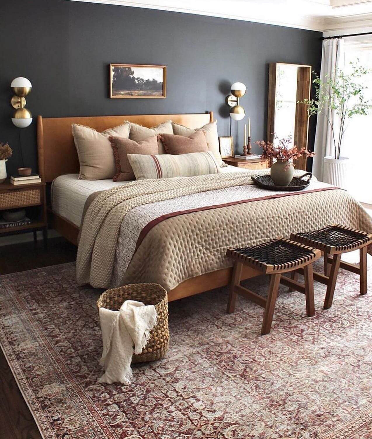 Balance deeper grains with lighter walls, creamy bedding, and reflective accents like aged brass or antiqued mirrors. Add layered lighting at warm temperatures to soften shadows and maintain inviting depth.