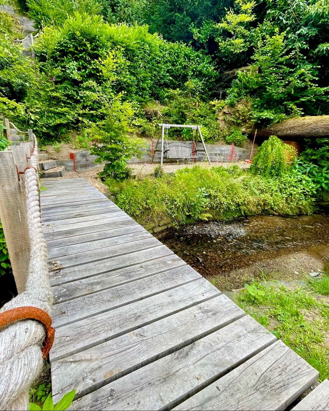 The meandering wooden path draws one into the garden; its rustic construction harmonizes with the surrounding greenery, providing a narrative of exploration and journey through nature. Utilize the gentle descent to your advantage by creating child-friendly zones that blend seamlessly with the botanical surroundings.