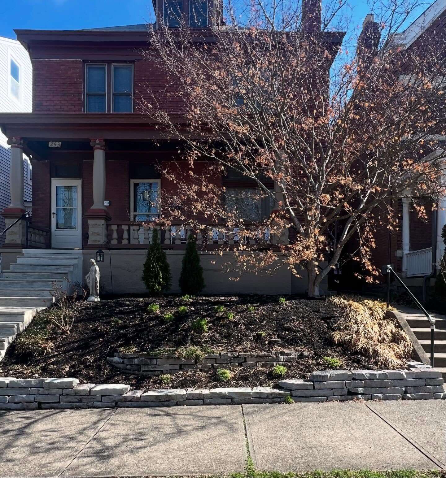 A historical brick facade paired with a creatively designed sloping garden sets a charming, welcoming tone for a home. This setup uses terracing to create distinct garden beds, each serving as a canvas for vibrant blooms or shrubs. The rustic stone retaining walls add texture and a sense of permanence, effectively combating erosion. This garden design harnesses a mix of native plantings to offer seasonal interest, allowing your garden to evolve beautifully over time. Integrating such thoughtful design elements not only preserves the historical character of the property but enhances its curb appeal, merging old-world charm with modern gardening practices.