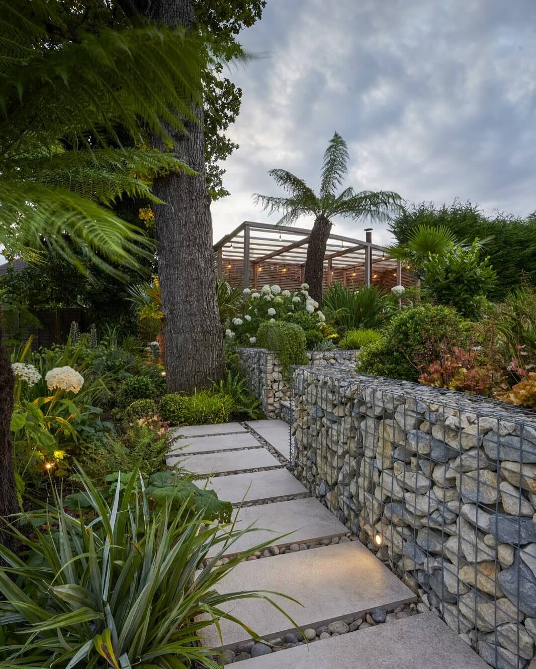 Embrace the contemporary elegance of gabion walls to give structure and definition to your sloping garden. These wire-caged stone structures are a chic and durable alternative to traditional retaining walls, providing effective erosion control while adding a modern edge. The natural stones within the gabions blend seamlessly with the leafy surroundings, enhancing the organic feel of the landscape.
