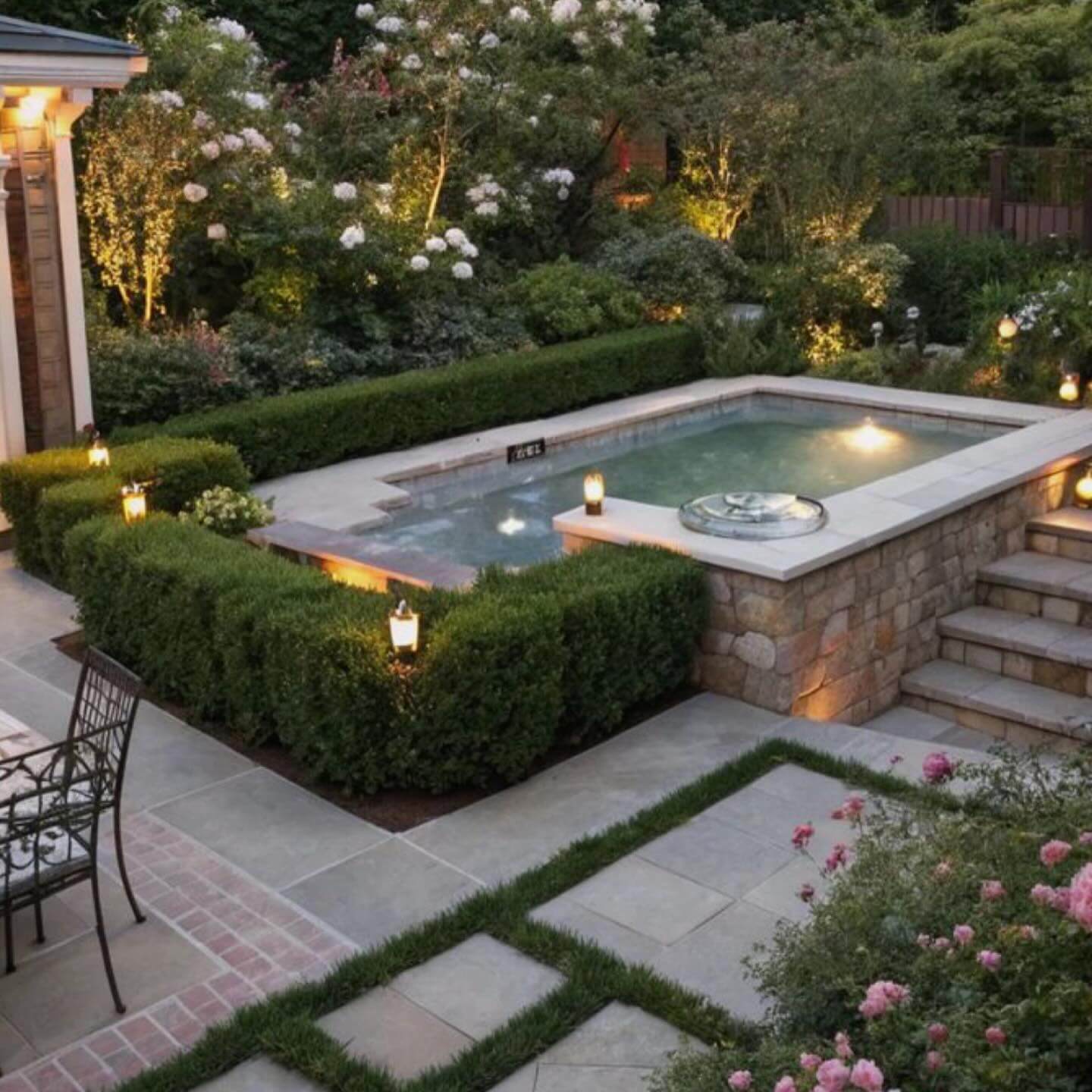 A ribbon path—widely spaced stepping stones with groundcover in between—guides movement and creates the illusion of depth in petite yards. Choose generous stone sizes so each step feels confident, then set a consistent stride to make circulation natural. Fill the joints with low, foot-tolerant plants like dwarf mondo grass, creeping thyme, or Irish moss for a lush, carpeted look that stays cooler than solid paving. In wetter climates, gravel or DG can stand in as a low-maintenance infill. Use gentle curves to slow the eye and reveal your micro-zones one at a time—lounge, bistro, herb nook—so the space unfolds like a garden walk instead of a single glance. Keep edges crisp with steel or paver borders, and echo the stone color in nearby planters for cohesion. This small backyard idea layers texture, manages runoff, and adds charm, all while preserving planting pockets that boost biodiversity and soften the hardscape.