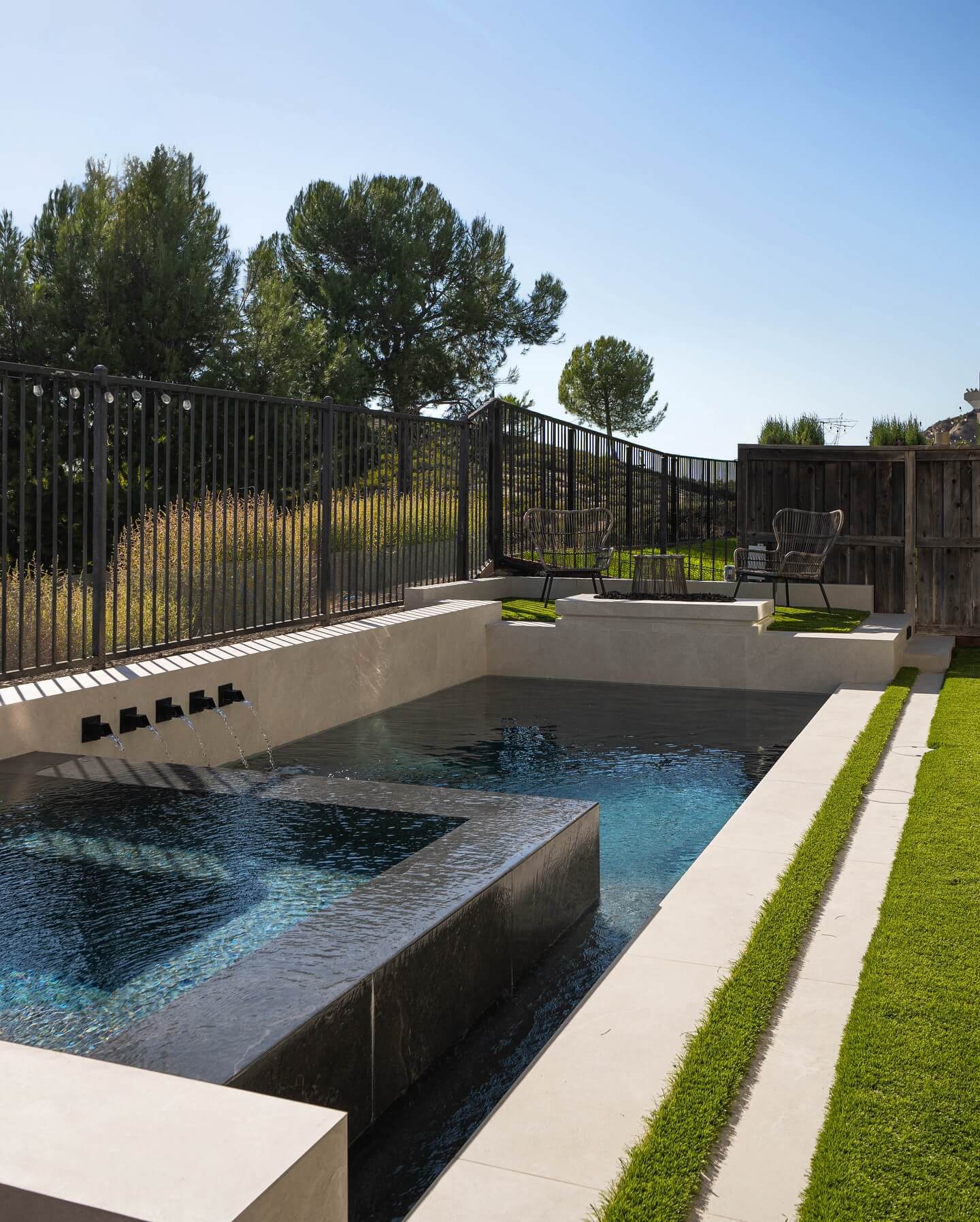 A narrow wall fountain, blade spillway, or slim trough with a recirculating pump brings calm to a compact yard and cleverly masks street noise. Aim for a footprint under 12 inches deep that nestles against a fence or wall, and choose darker materials (charcoal, slate, weathered steel) so the feature visually recedes. The gentle sound layer makes the space feel private without raising walls. Keep maintenance easy: a simple pump with an inline filter, a GFCI-protected outlet, and a weekly top-up to counter evaporation. Add marginal plants in adjacent containers—papyrus, sweet flag, or horsetail—for a soft, architectural edge. At night, a single submersible or grazing uplight turns ripples into a kinetic art piece. In cold climates, drain and store the pump in winter; in warm zones, add mosquito dunks as needed. The result is a micro-oasis that cools the air, attracts pollinators, and elevates the whole backyard experience.