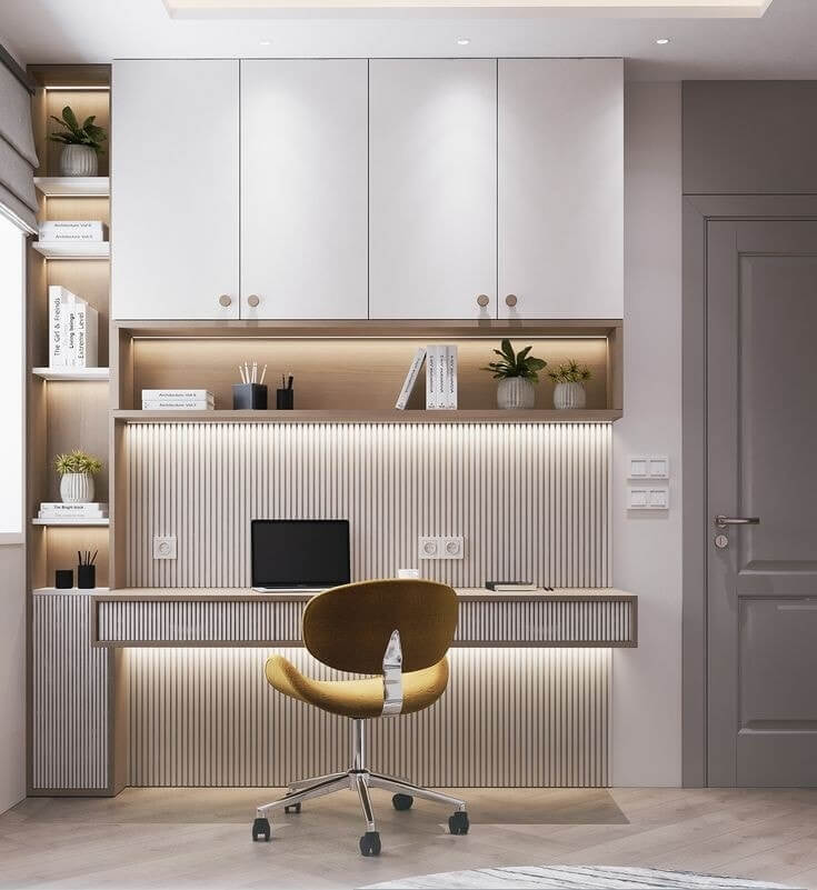 If your desk sits beneath shelves, turn that vertical space into a lighting asset. Install under-shelf LED strips to create an even “floating” wash over your work surface. Use aluminum channels with opal diffusers to eliminate diode dots and cast a soft, shadow-free beam across notebooks and keyboards. Target neutral-white (4000–4500K) for study clarity, and add a dimmer or touch switch mounted under the shelf for quick control. Keep wiring invisible by routing through cable raceways along the shelf underside and down the rear support—clean lines keep the whole setup feeling serene. For brightness, 700–1,200 lumens per shelf section typically delivers 500–800 lux at desk height, depending on distance. This approach pairs perfectly with bias lighting and a small floor uplight for balanced layers. Bonus: under-shelf light keeps the center of your desk clear, so you can slide a laptop, open a textbook, or sketch without moving a lamp. It’s minimalist, practical, and productivity-forward.