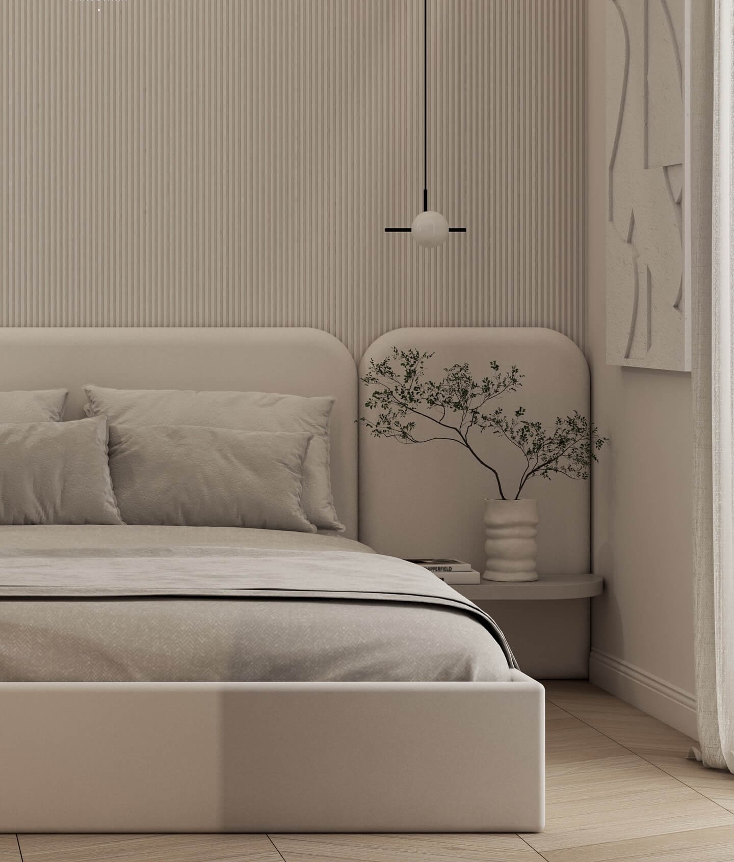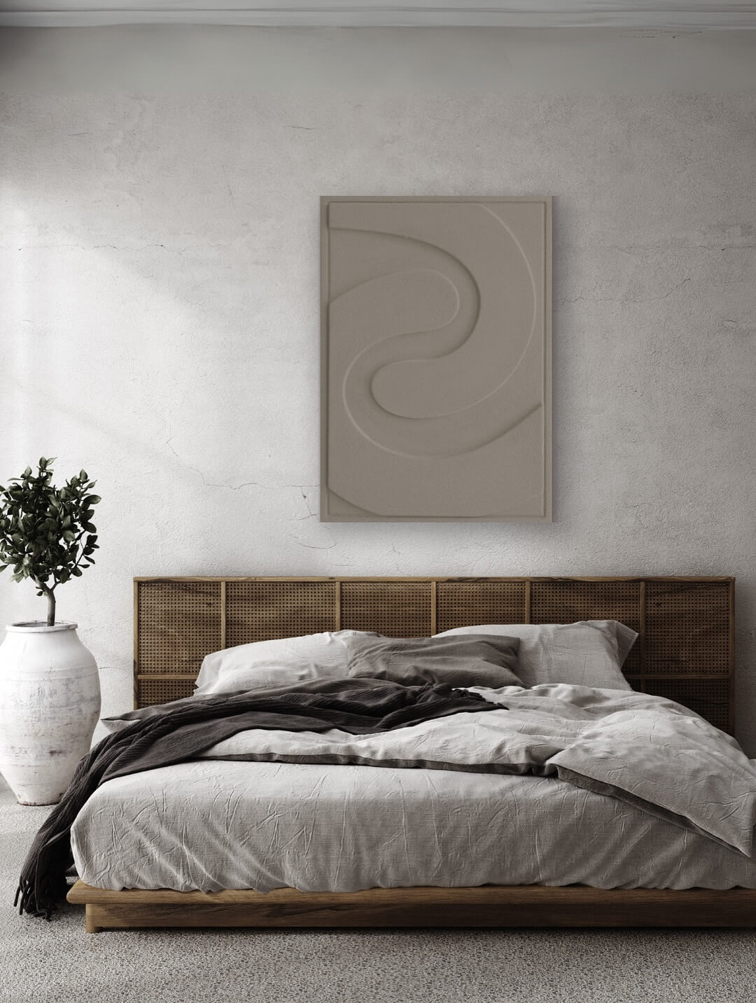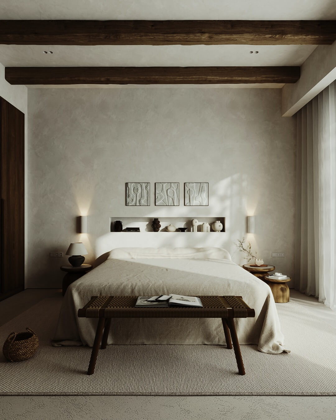 A wabi-sabi bedroom favors breathability, stillness, and ritual. Anchor the space with a low platform bed—wood or upholstered in natural fabric—to foster a cocooning feel. Dress it in stonewashed linen or cotton in muted tones (ecru, clay, slate) that soften with every wash and look beautiful rumpled. Trade busy patterns for texture: a nubby throw, a quilted coverlet, or a wool blanket provides tactile depth without visual noise. Keep nightstands simple and functional: a small tray, a carafe, one beloved book. Window treatments should filter light rather than block it—gauzy curtains or linen panels that catch the breeze. Avoid bright overheads; instead, layer bedside sconces or table lamps with warm bulbs to signal wind-down. A branch, a ceramic cup, a single framed print—edit to essentials that mean something to you. The aim is restorative quiet, where imperfect folds, sun-faded textiles, and the patina of everyday use become part of the room’s gentle rhythm.