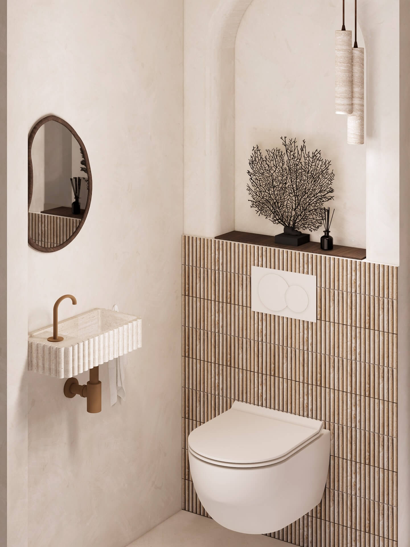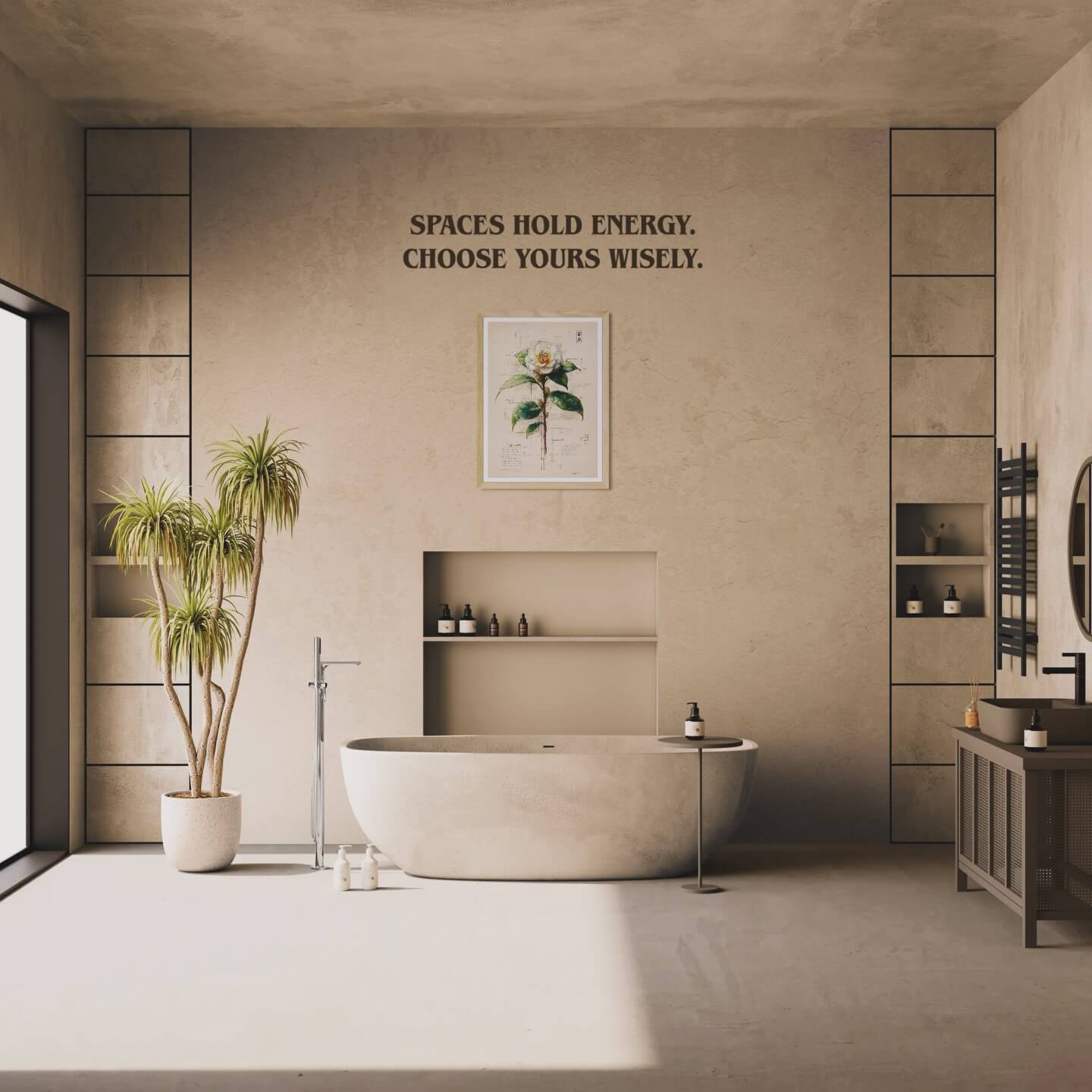 A tranquil bath doesn’t need polish to feel luxurious. Lean into tactile finishes—tadelakt or lime plaster walls, honed stone, river pebbles, teak or cedar accents—that respond beautifully to steam and age with grace. Keep the color story muted and cohesive, letting shadows and light create the drama. Replace shiny chrome with darkened brass or oiled bronze to soften the sheen. Store toiletries in woven baskets or ceramic jars, leaving only the essentials within reach. A low stool, a wooden bath caddy, and a linen towel stack introduce warmth and practical comfort. Consider a single sprig in a bud vase or a strand of eucalyptus for scent without clutter. Lighting should be gentle and indirect—wall washers, a shaded sconce, even candlelight during evening soaks—to encourage a slower pace. In wabi-sabi, a bath is a ritual of renewal, and small irregularities—the hand of the plaster, water marks in stone—become part of the room’s living patina.